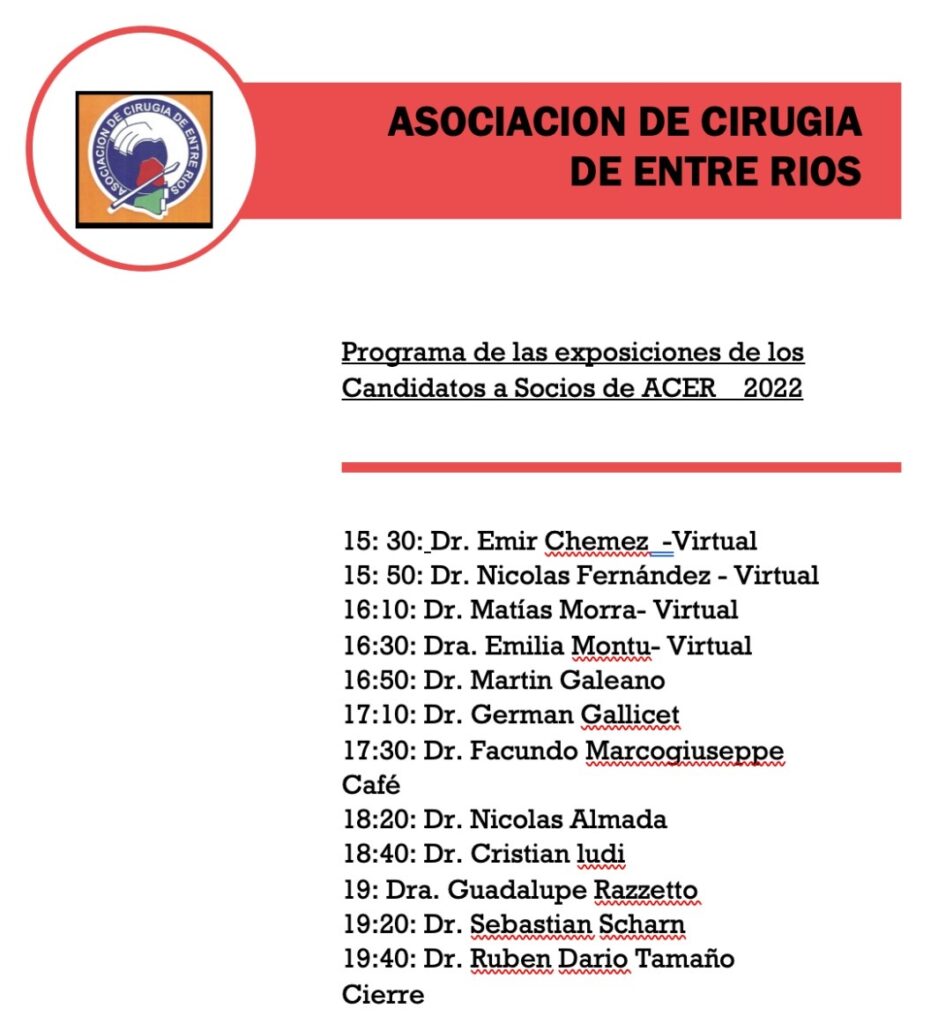 La Asociación de Cirugía de Entre Ríos (ACER) invita a los cirujanos y cirujanas de la provincia a incorporarse a nuestra asociación para ello se realizará una JORNADA DE INGRESO a la ACER, con modalidad mixta, presencial y virtual.